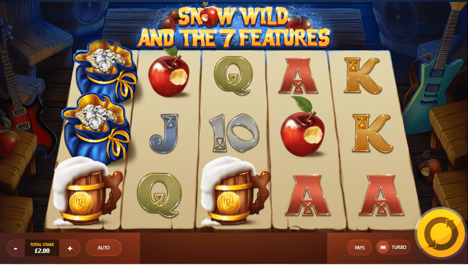 The Snow Wild and the Seven Features theme will make you reminisce about your childhood. We love that all of the 7 dwarfs have been featured in the game. The game's action is set in what looks like the dwarfs’ workshop. Symbols include; a half-eaten apple, steins of beer, a pouch of diamonds, electric guitars, etc. The visuals pop out on mobile devices, mostly.